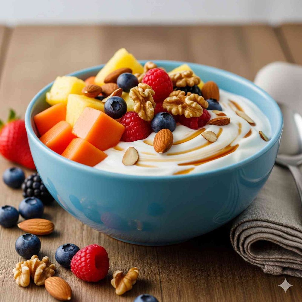 The combination of protein from the yogurt, fiber from the fruits, and healthy fats from the nuts makes this one of the most balanced and nutrient-dense breakfast options—light yet filling, and perfect for busy mornings.